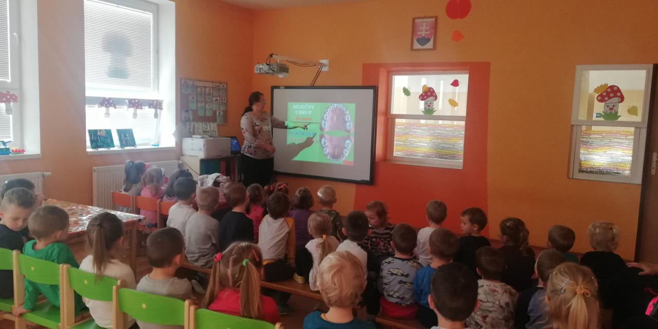 Dňa 20.11.2019 navštívila našu materskú školu pracovníčka RÚVZ z Čadce p. Mgr. Jana Grešáková, ktorá si pripravila pre naše deti prednášku k prevencii vzniku zubného kazu. Zaujímavým rozprávaním deťom priblížila, aké dôležité je ústne zdravie.
