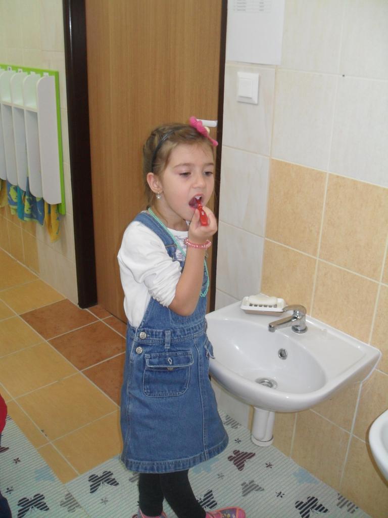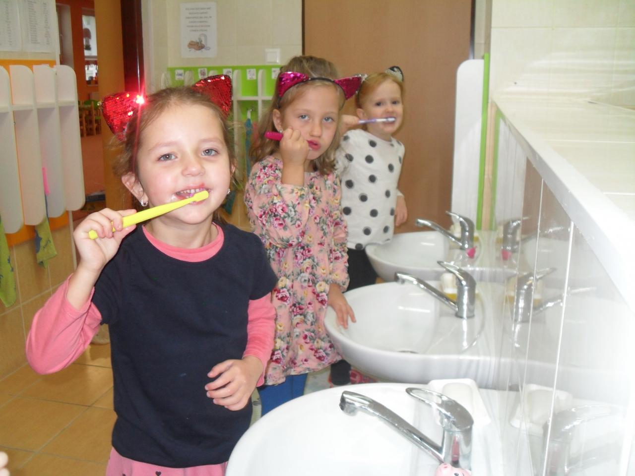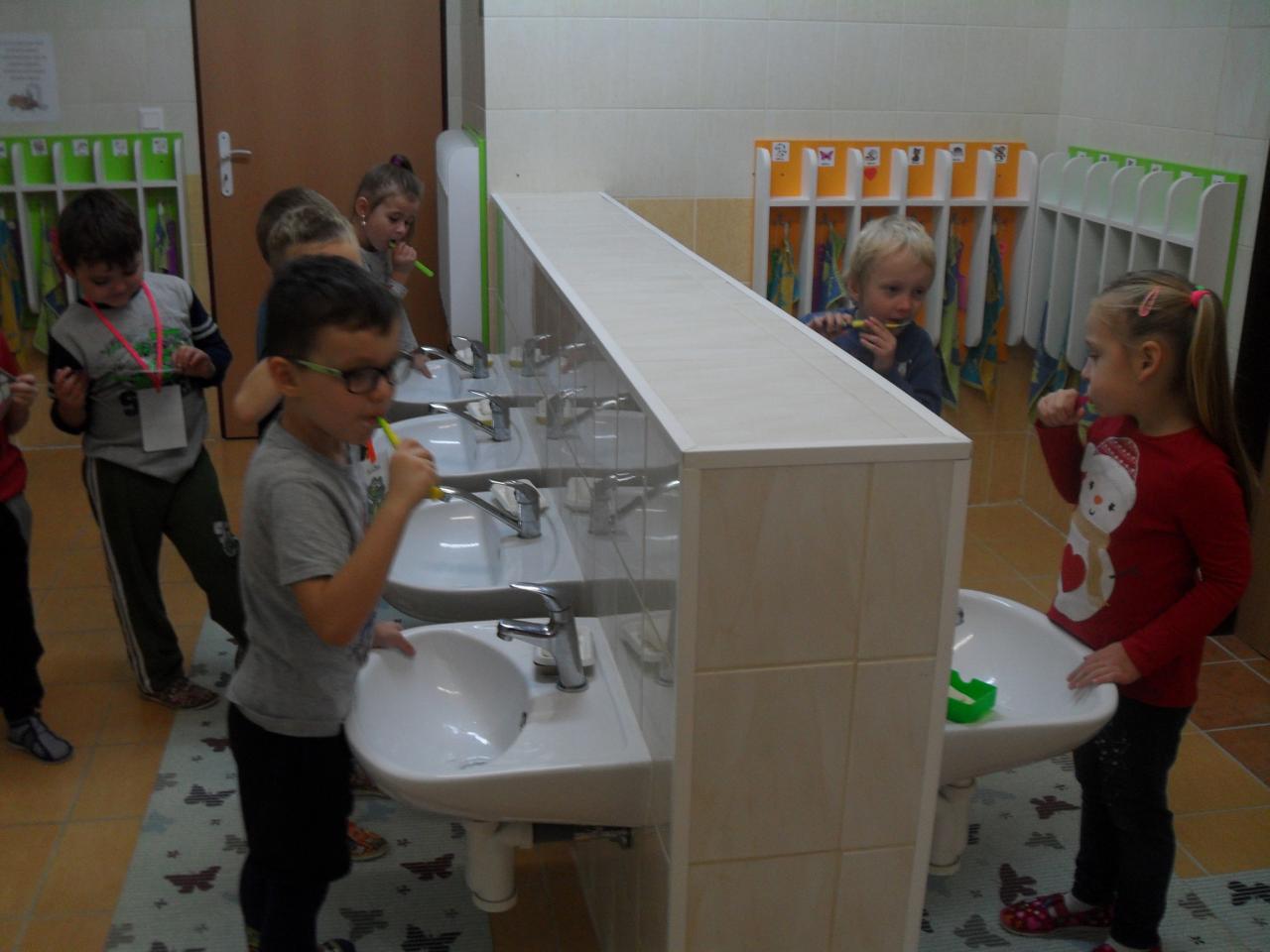 Nasledujúci deň si všetky deti priniesli do MŠ zubnú kefku, aby si zopakovali správnu techniku čistenia zubov v umyvárni s krátkou básničkou, ktorú sa na prednáške naučili: „Hupky- dupky, teraz máme krásne, čisté zúbky“.