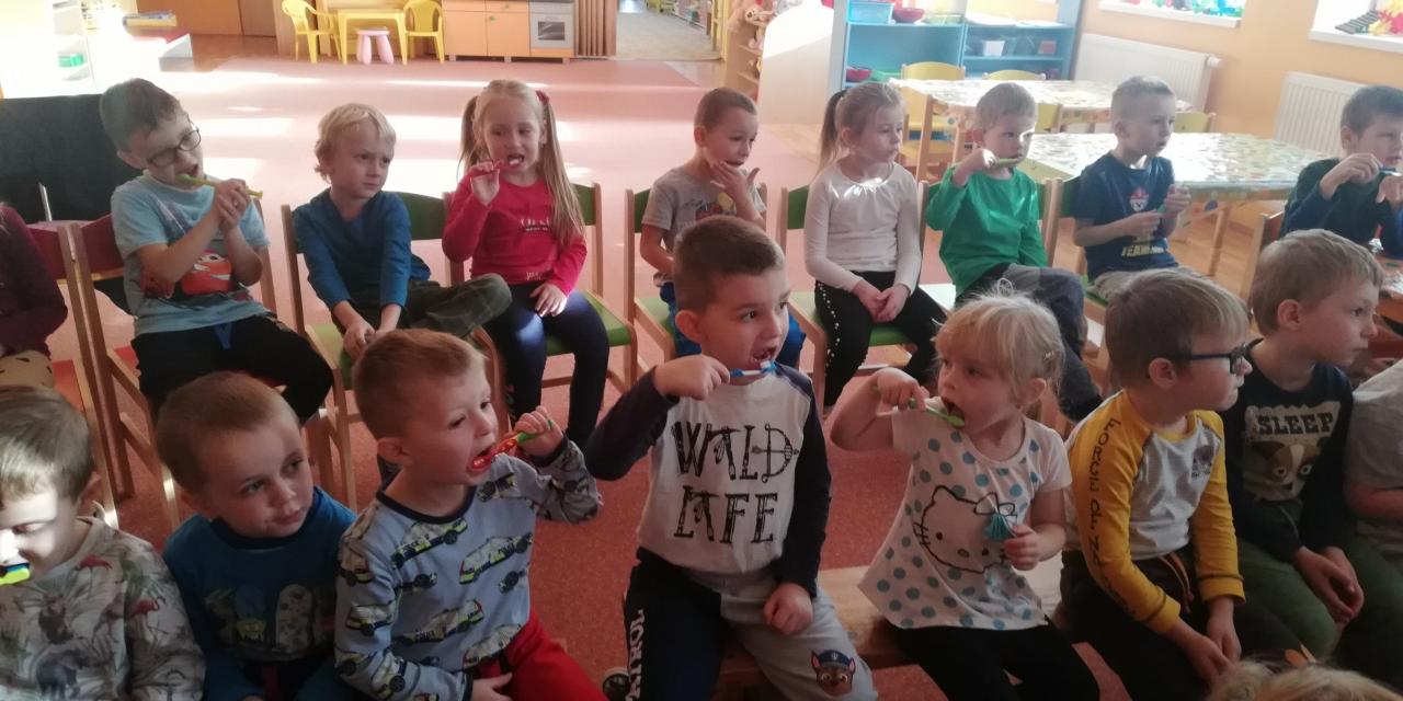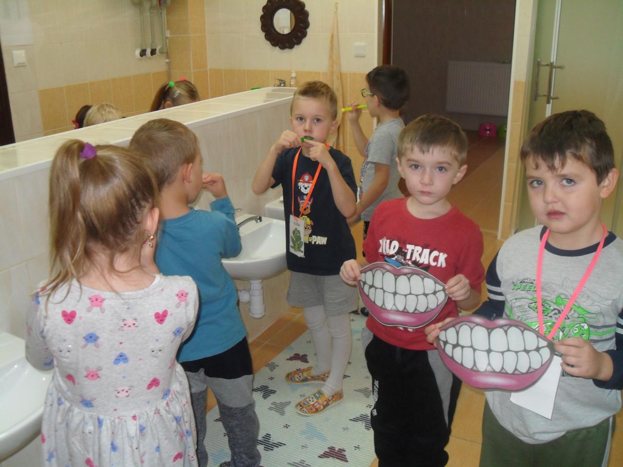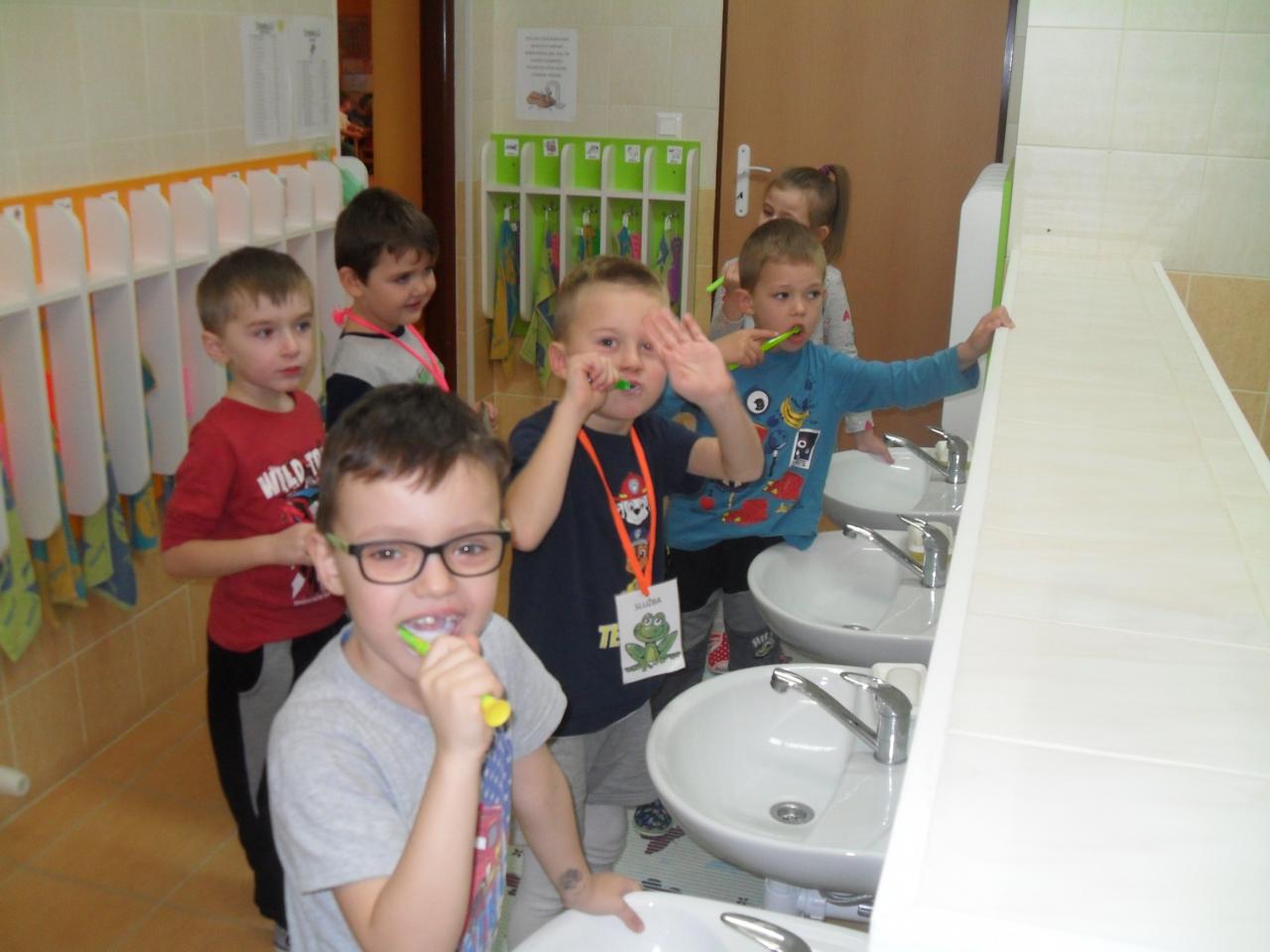 Nasledujúci deň si všetky deti priniesli do MŠ zubnú kefku, aby si zopakovali správnu techniku čistenia zubov v umyvárni s krátkou básničkou, ktorú sa na prednáške naučili: „Hupky- dupky, teraz máme krásne, čisté zúbky“.