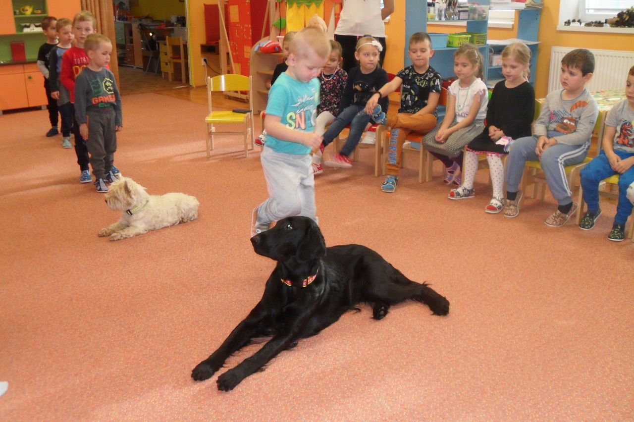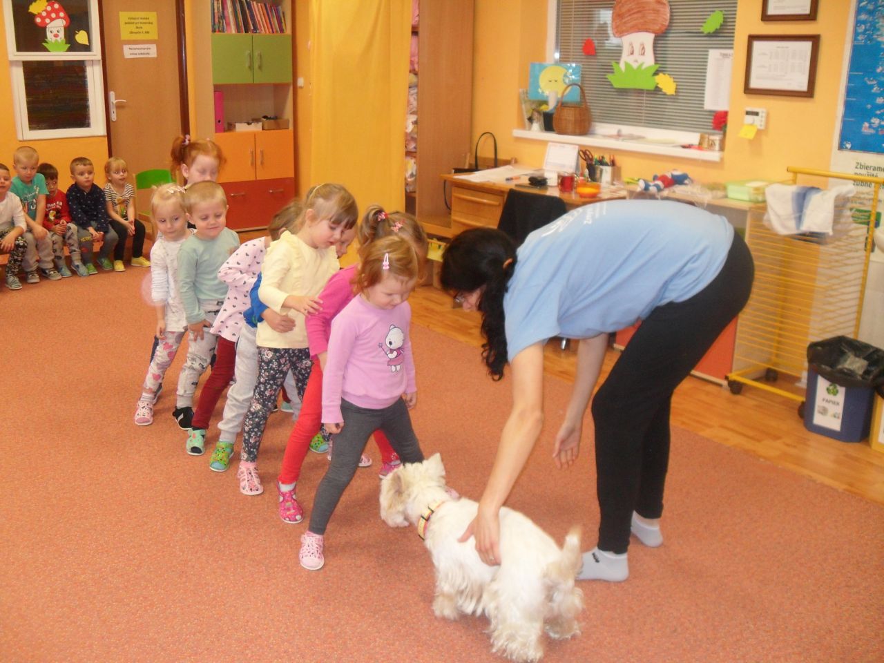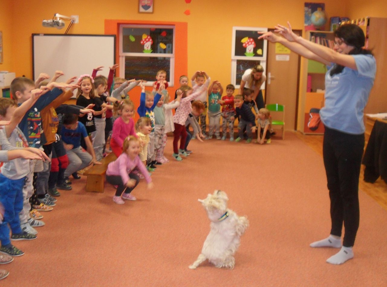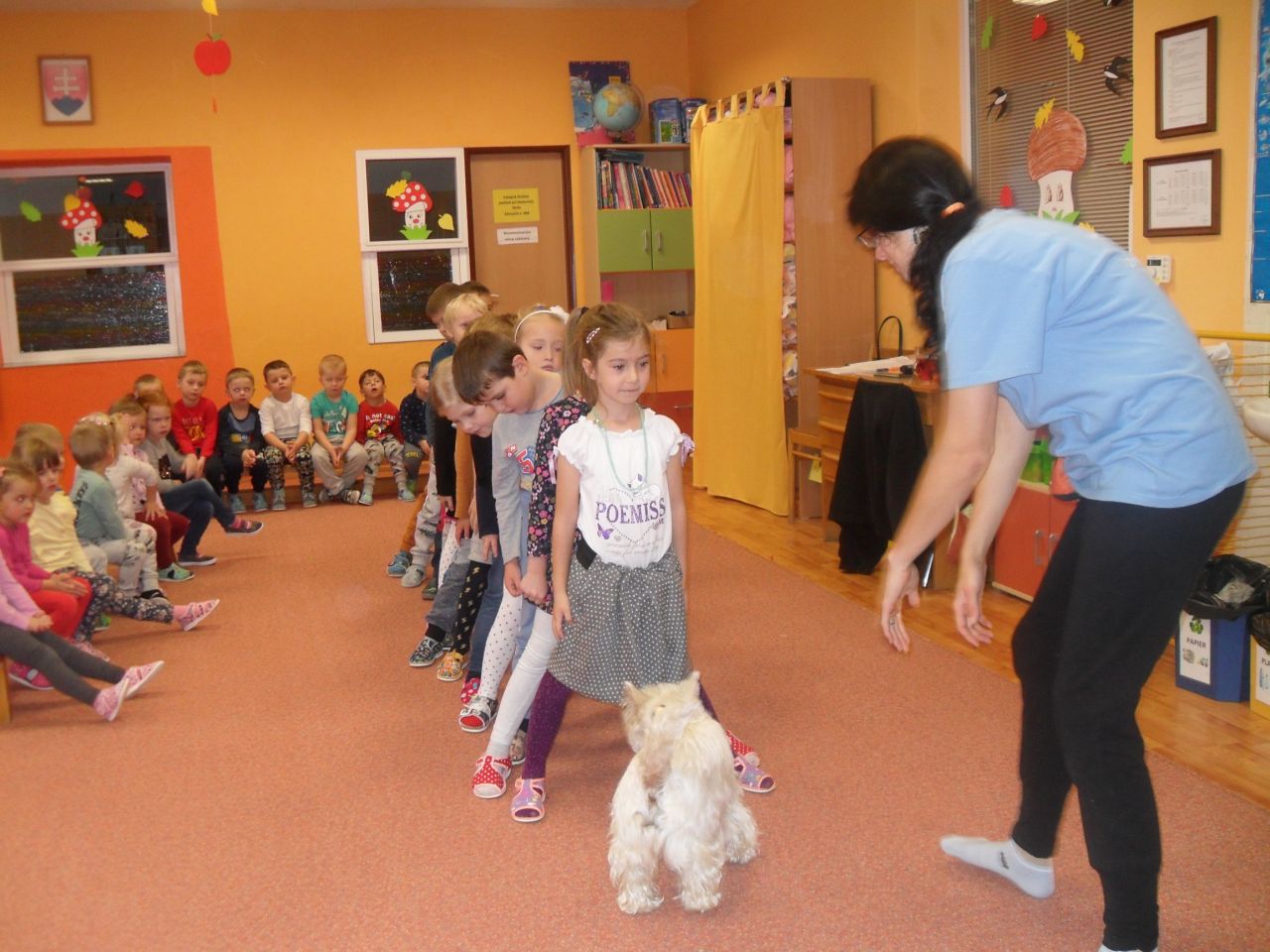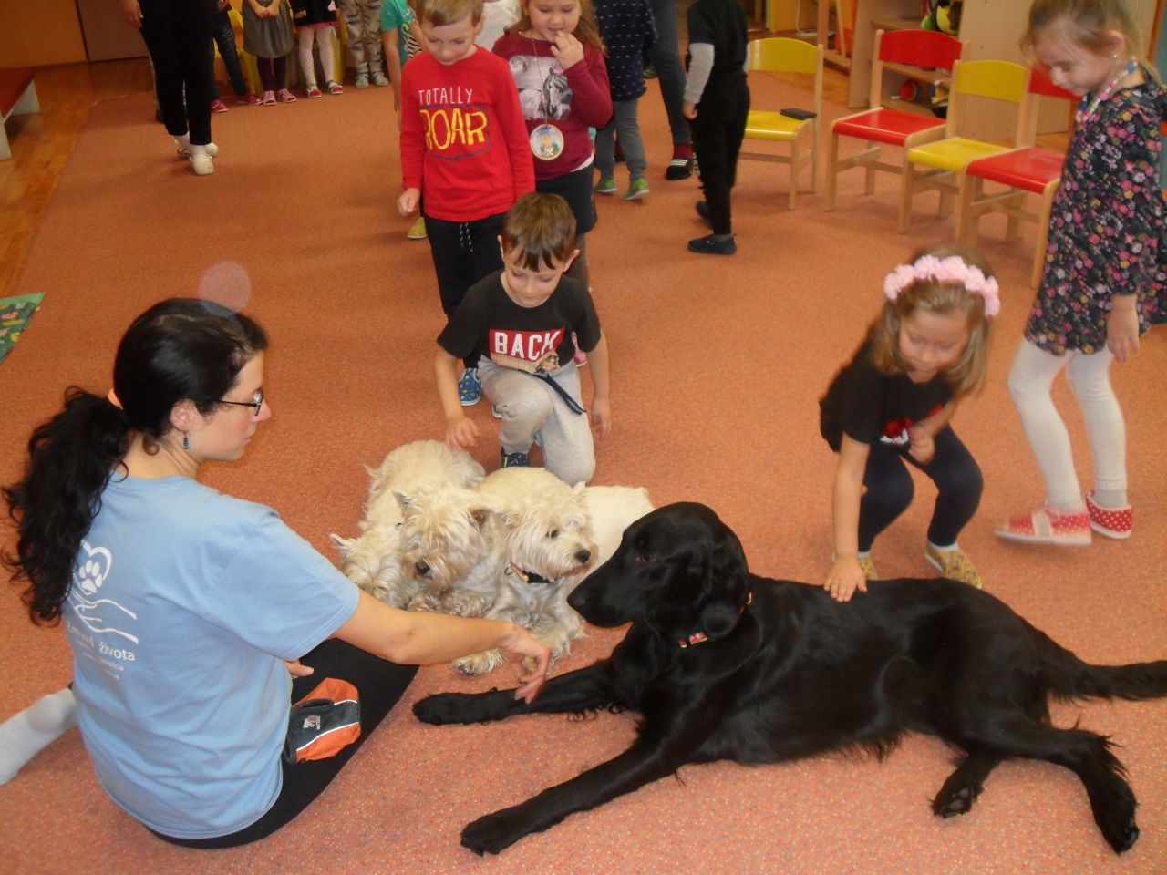 Dňa 5.11.2019 navštívila našu materskú školu riaditeľka neziskovej organizácie Zmysel života. Na začiatku predstavila psíkov a ukázala deťom, ako poslúchajú na prvé slovo všetky pokyny. Prostredníctvom alternatívnej metódy, tzv. canisterapie navodila príjemné a krásne pocity u detí, viedla ich k uvoľneniu a upokojeniu priamym kontaktom so psami.