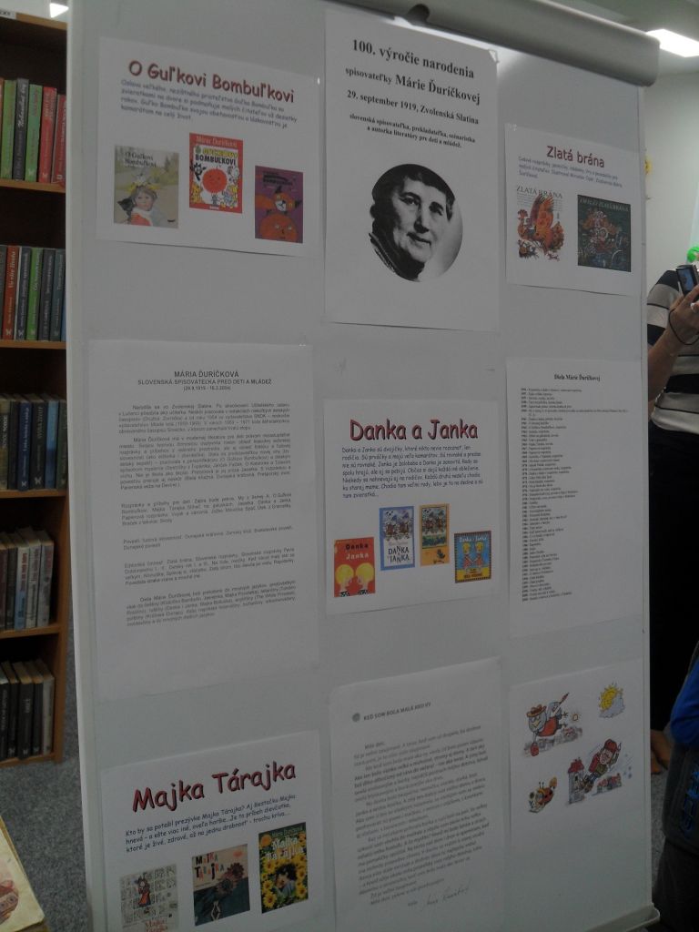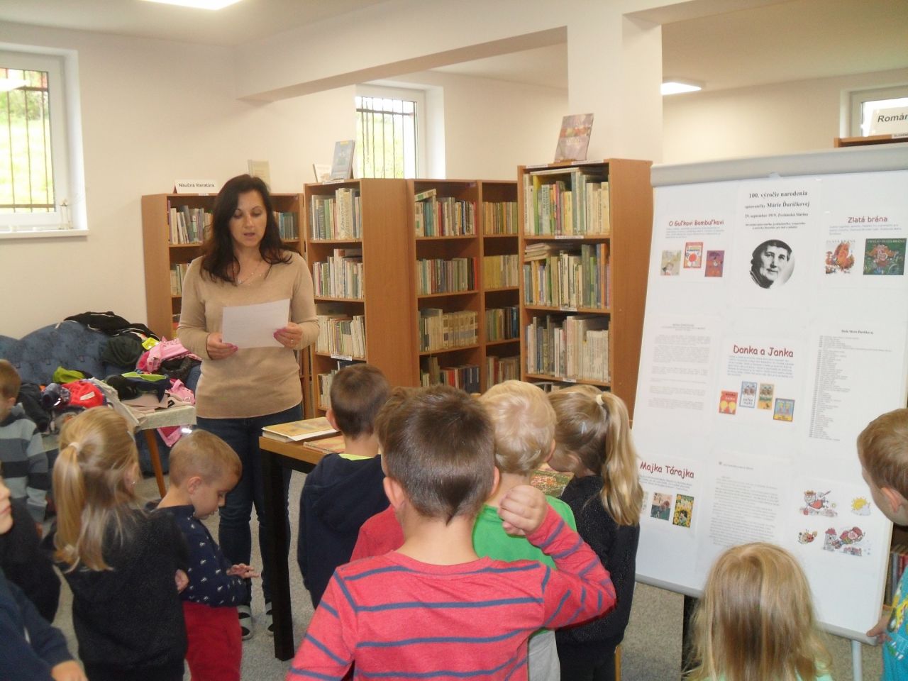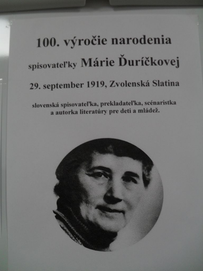 V roku 2019 si pripomíname 100. výročie narodenia jednej z najvýznamnejších slovenských spisovateliek – Márie Ďuríčkovej. Pri tejto príležitosti, deti z triedy č.1 a č.2, dňa 17.09.2019 navštívili Obecnú knižnicu, v ktorej teta knihovníčka pripravila prezentáciu o tejto spisovateľke a jej tvorbe.