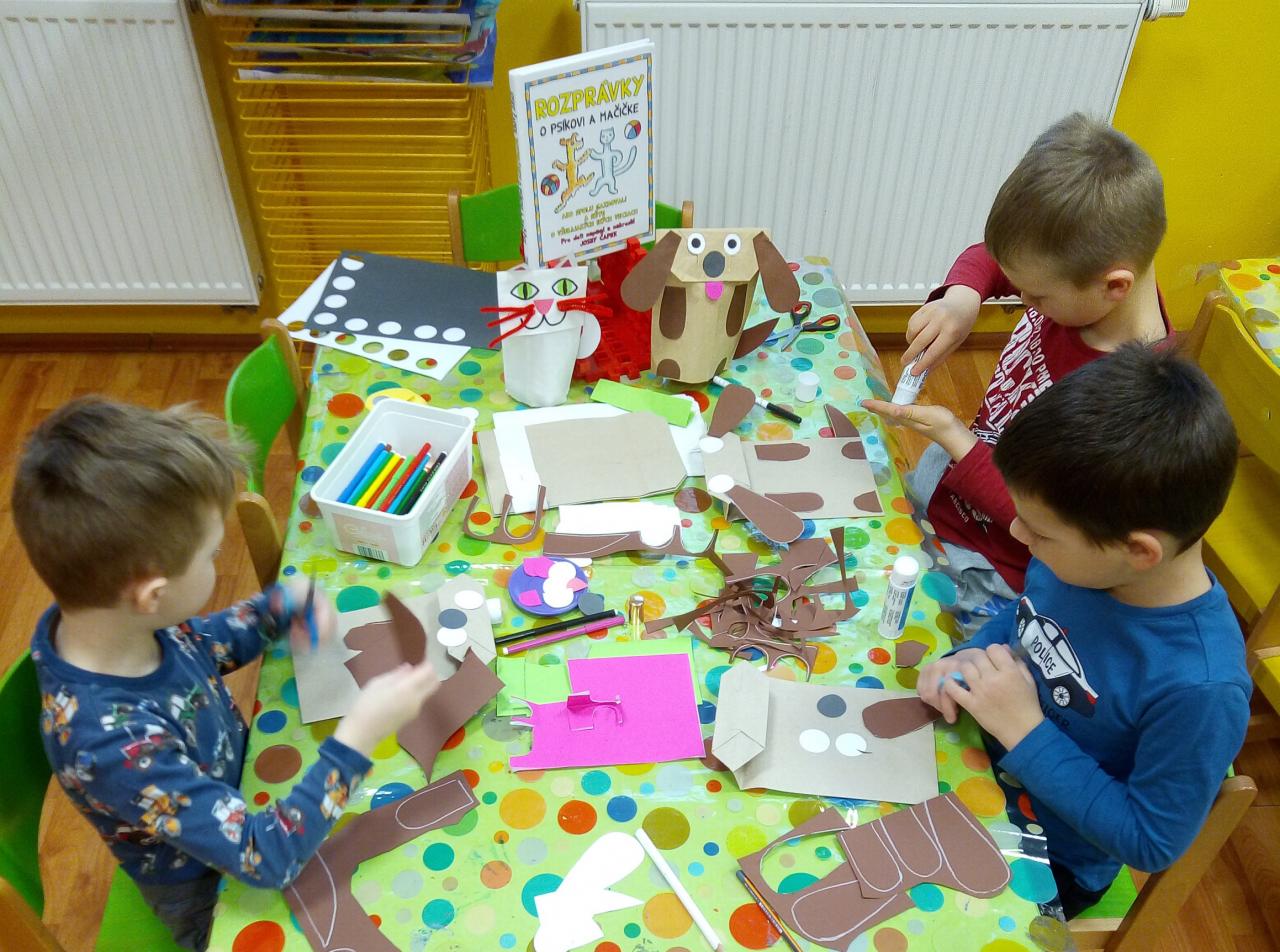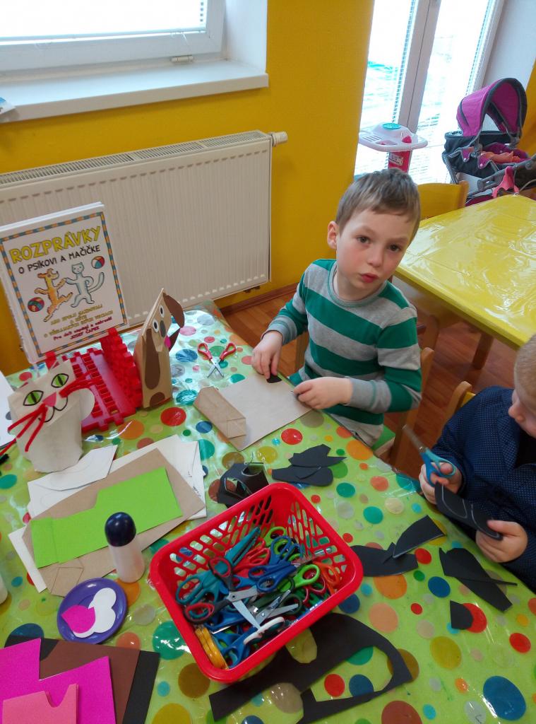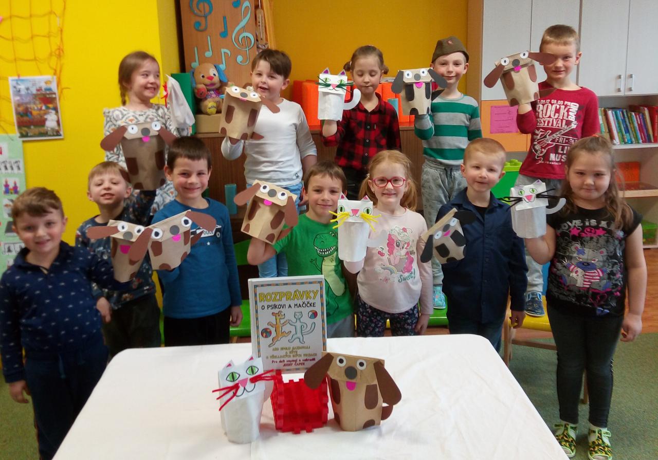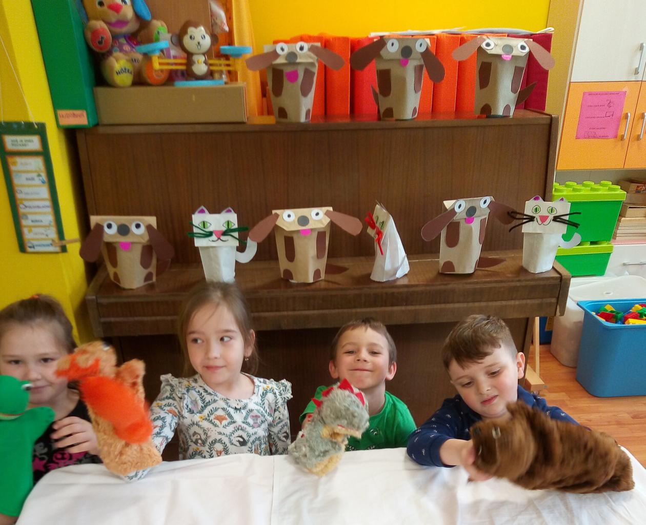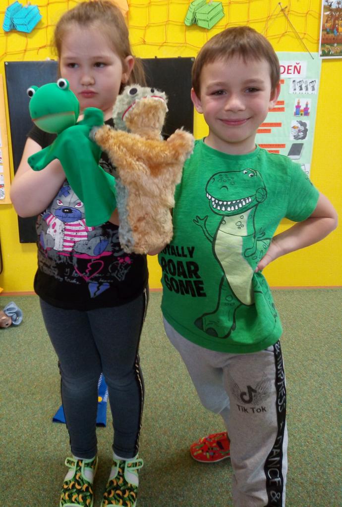 V triede č.2 žabky si deti pozreli poučnú rozprávku „Kto má zuby“, oboznámili sa s niektorými druhmi bábok, sami si zahrali bábkové divadlo a vyrobili si maňušky psíka a mačičky.