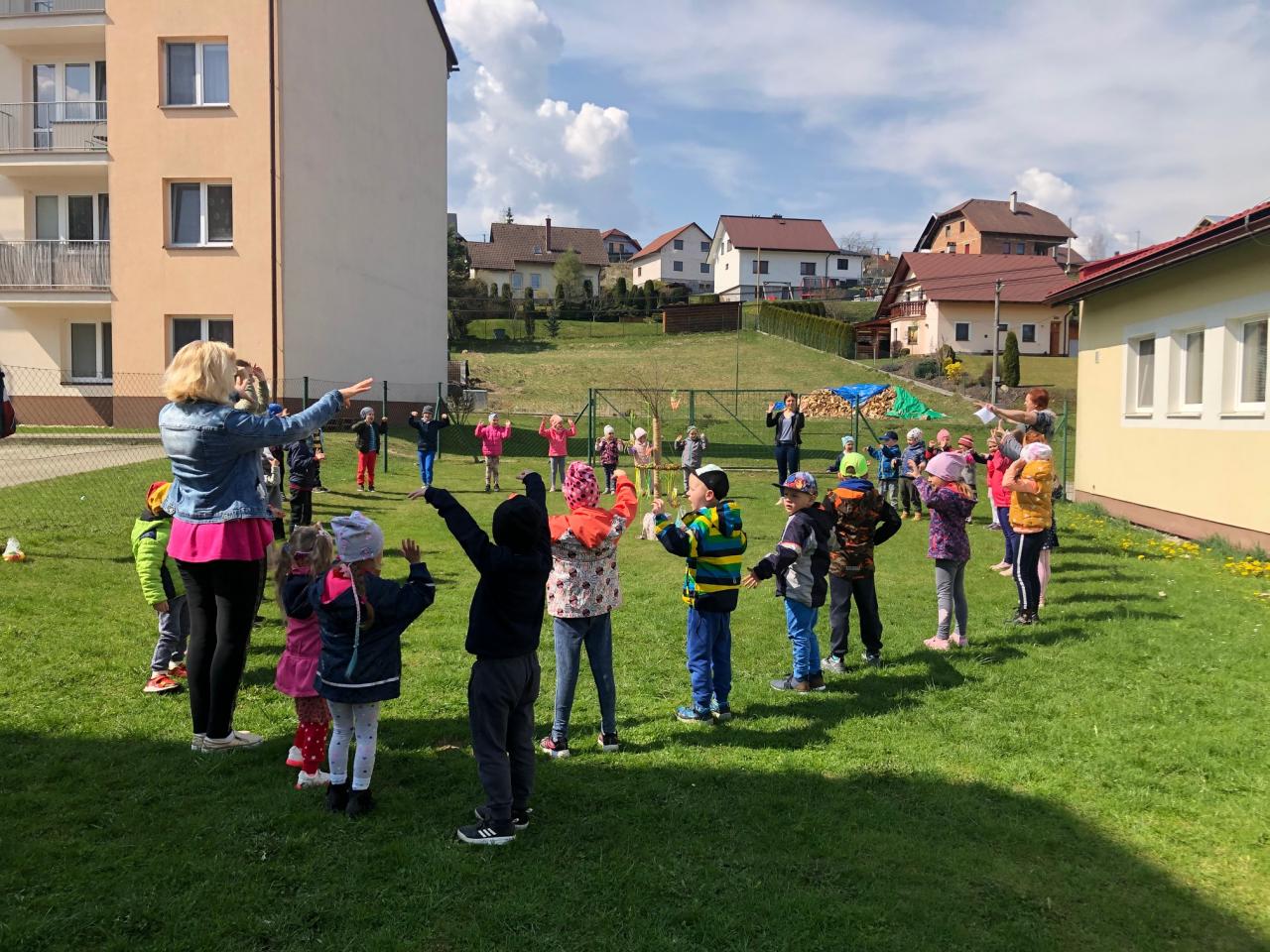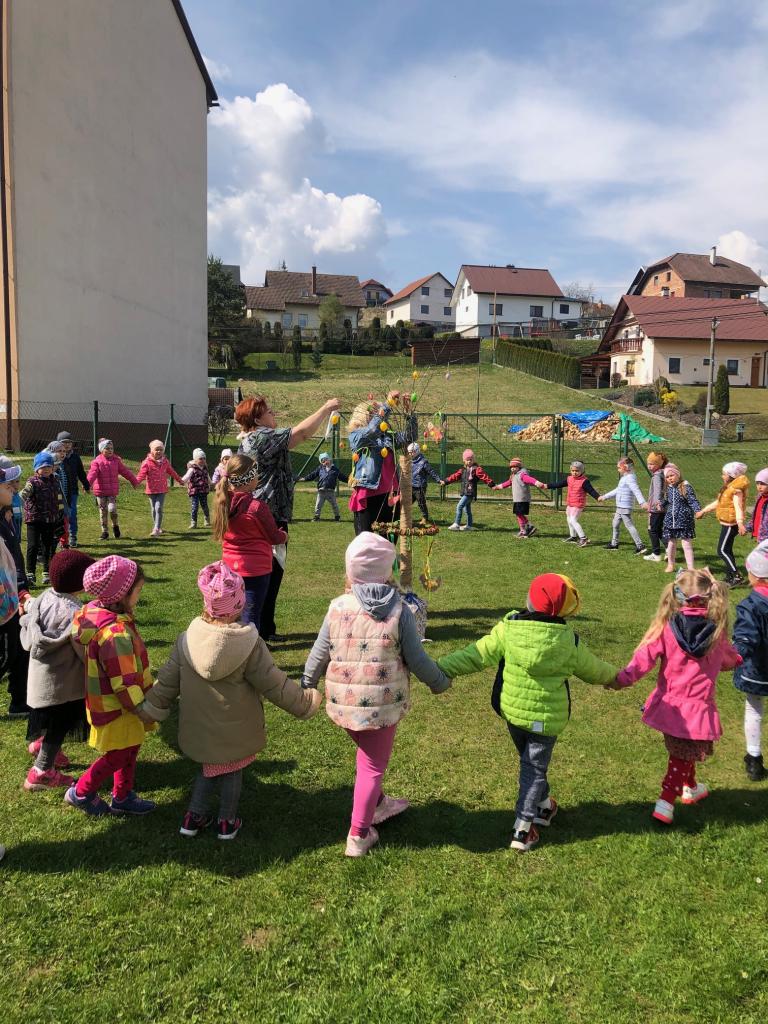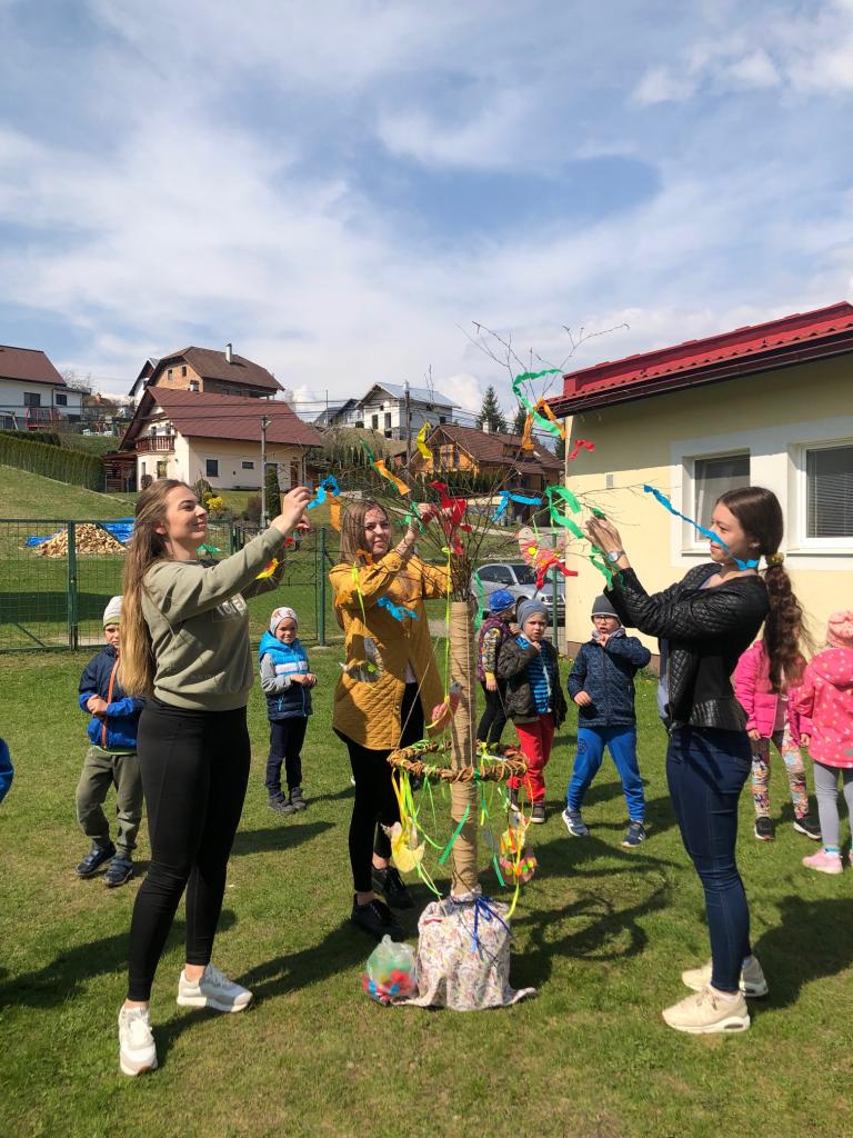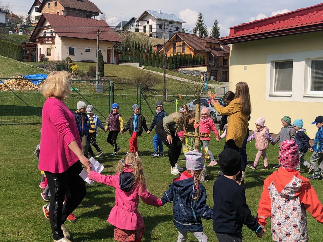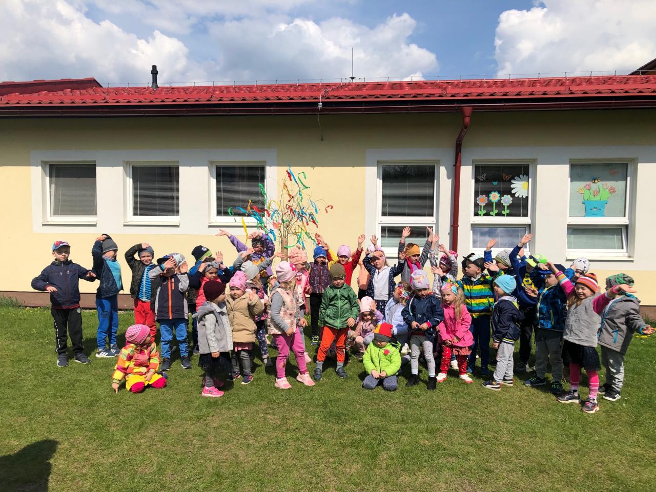 Za spoločného spevu piesne "Sadíme my máje" zdobili naše mladé pani učiteľky vrcholce Mája farebnými stuhami. Deti im k tomu spievali detské ľudové piesne a tešili sa z krásne ozdobeného stromu, ktorý síce nie je veľký, ale o to väčšiu radosť z neho deti majú. Veselý, farebný Máj vedľa vchodu do materskej školy, bude vítať i odprevádzať naše deti počas celého mesiaca. Deti si aj takýmto spôsobom pripomínajú ľudové tradície regiónu.