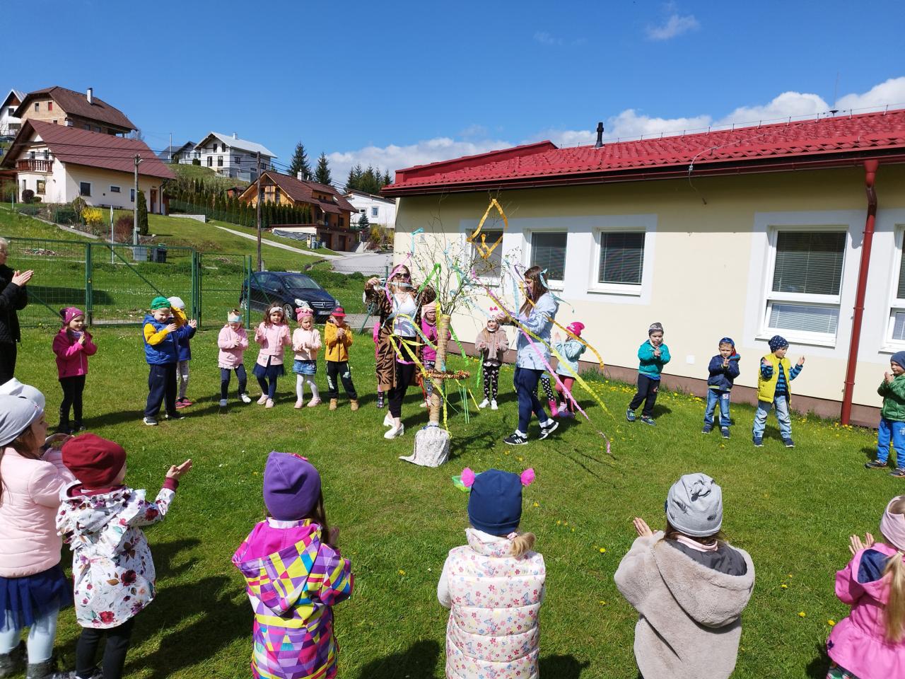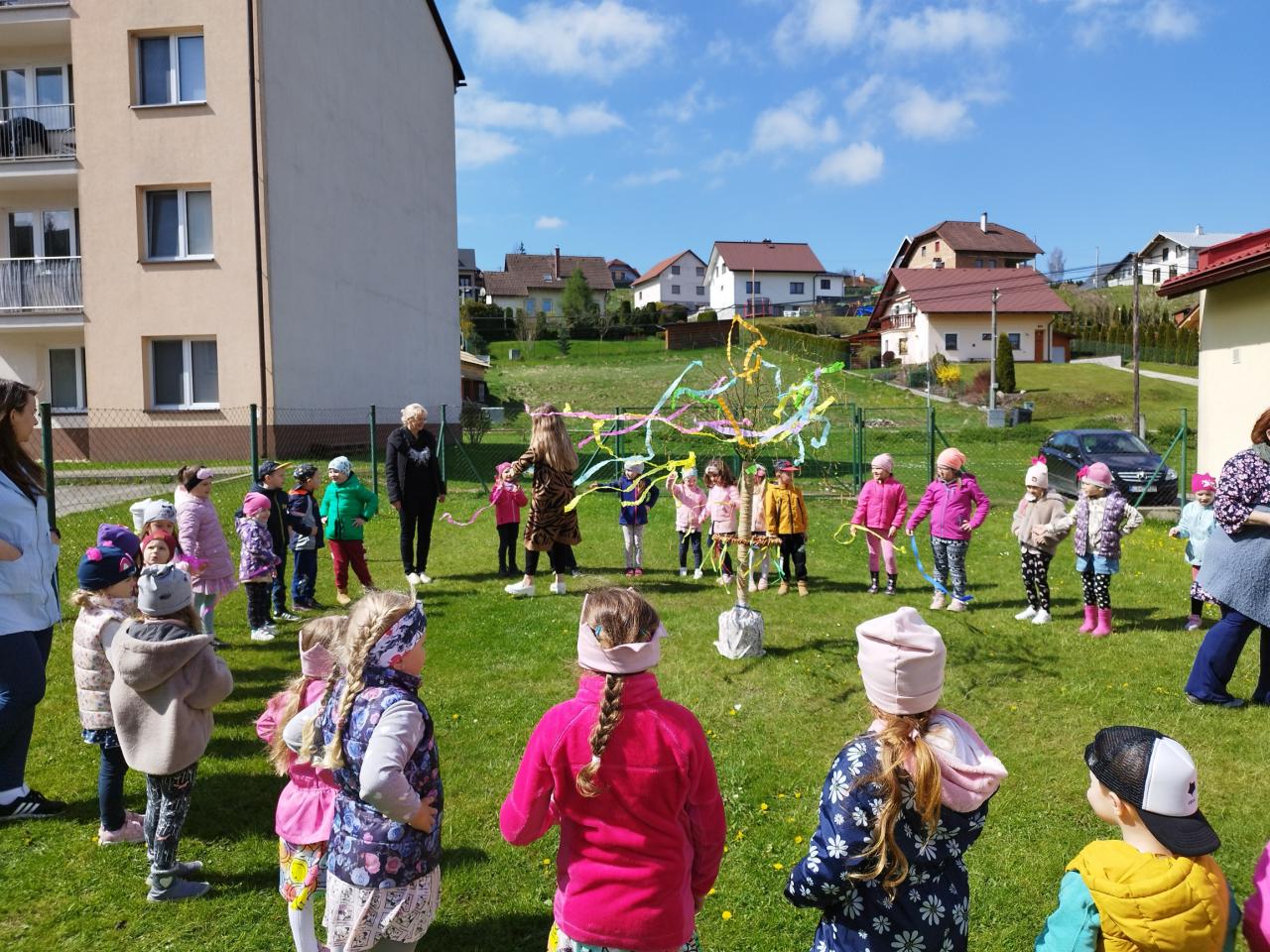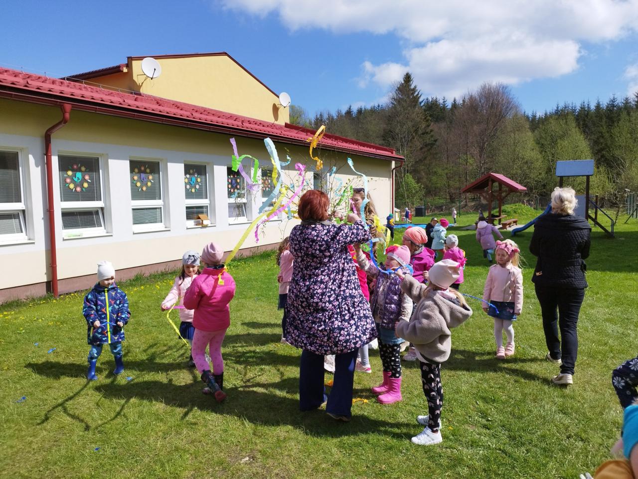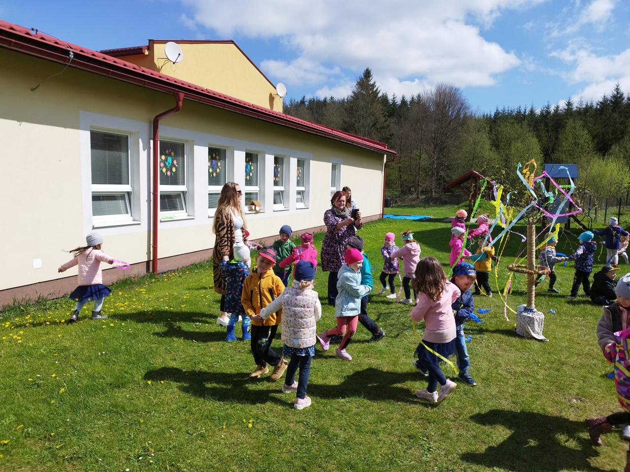 Za zvuku známych ľudových piesní i spevu piesne „Máj, máj, máj“ zdobili naše mladé pani učiteľky pripravený máj farebnými stuhami z krepového papiera. Deti im pri tom spievali a tancovali. Spoločne sme sa tešili z krásne ozdobeného Mája, ktorý bude pri vchode do MŠ krášliť okolie celý mesiac. Deti si aj takýmto spôsobom pripomenuli regionálne tradície.