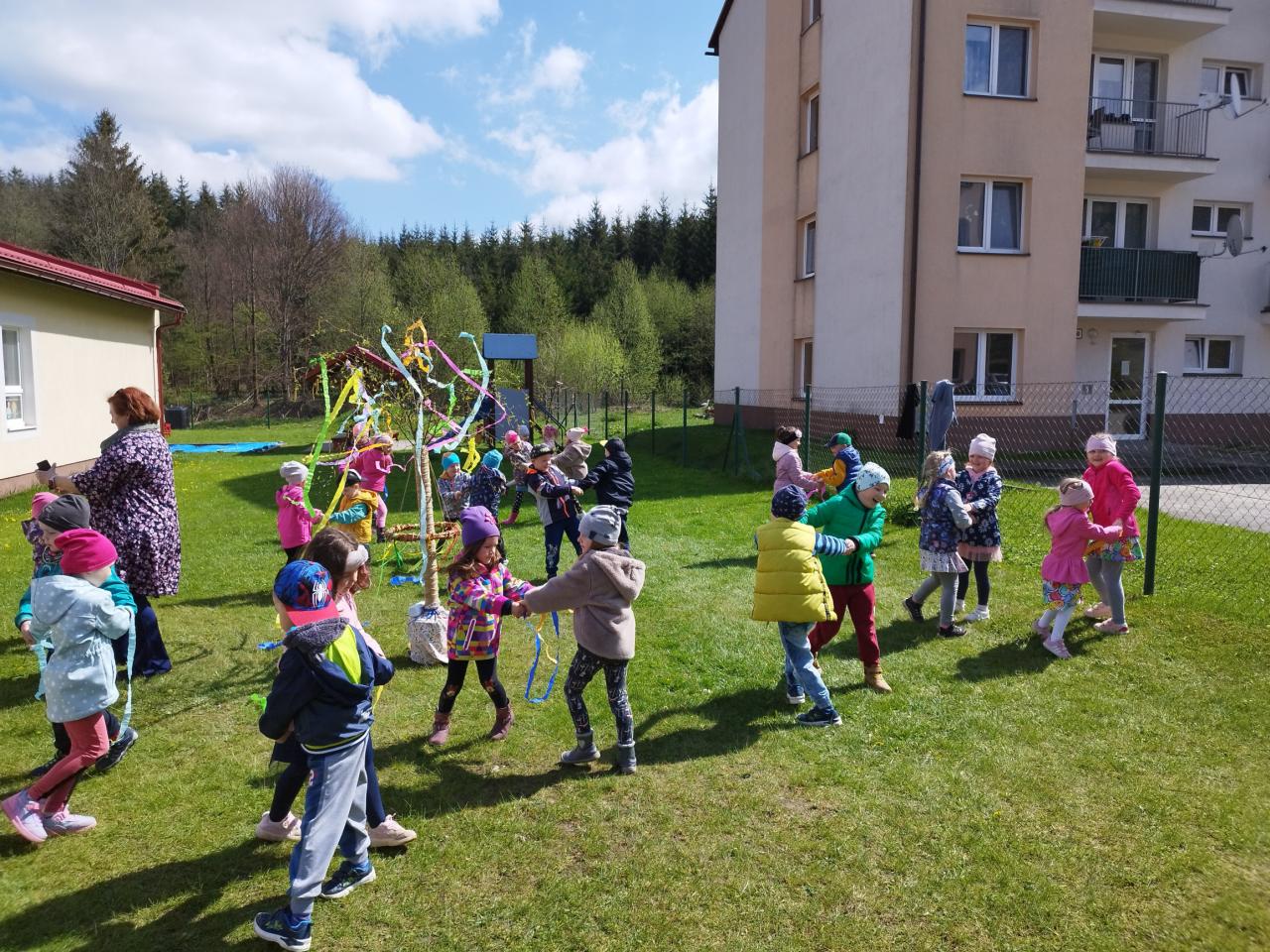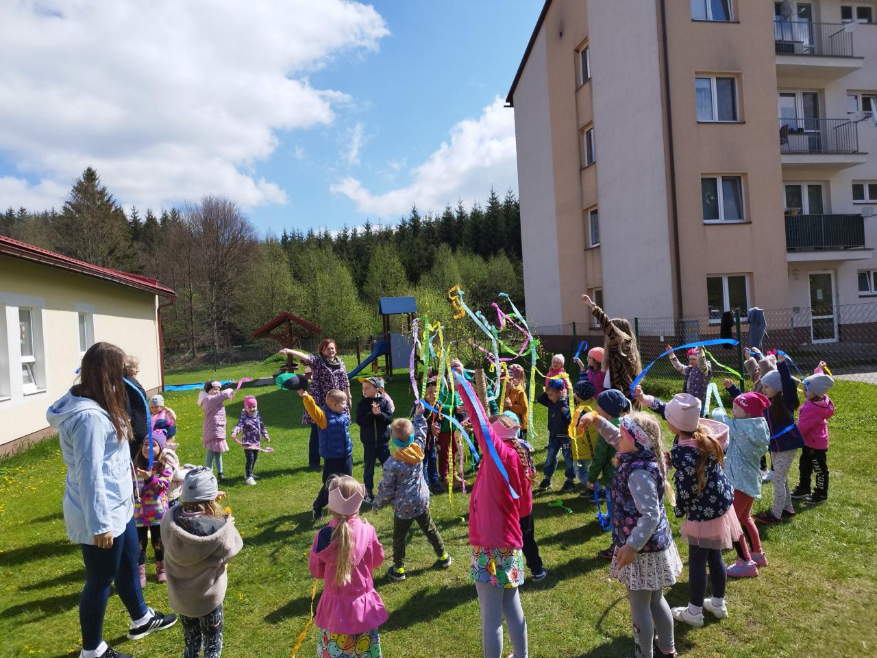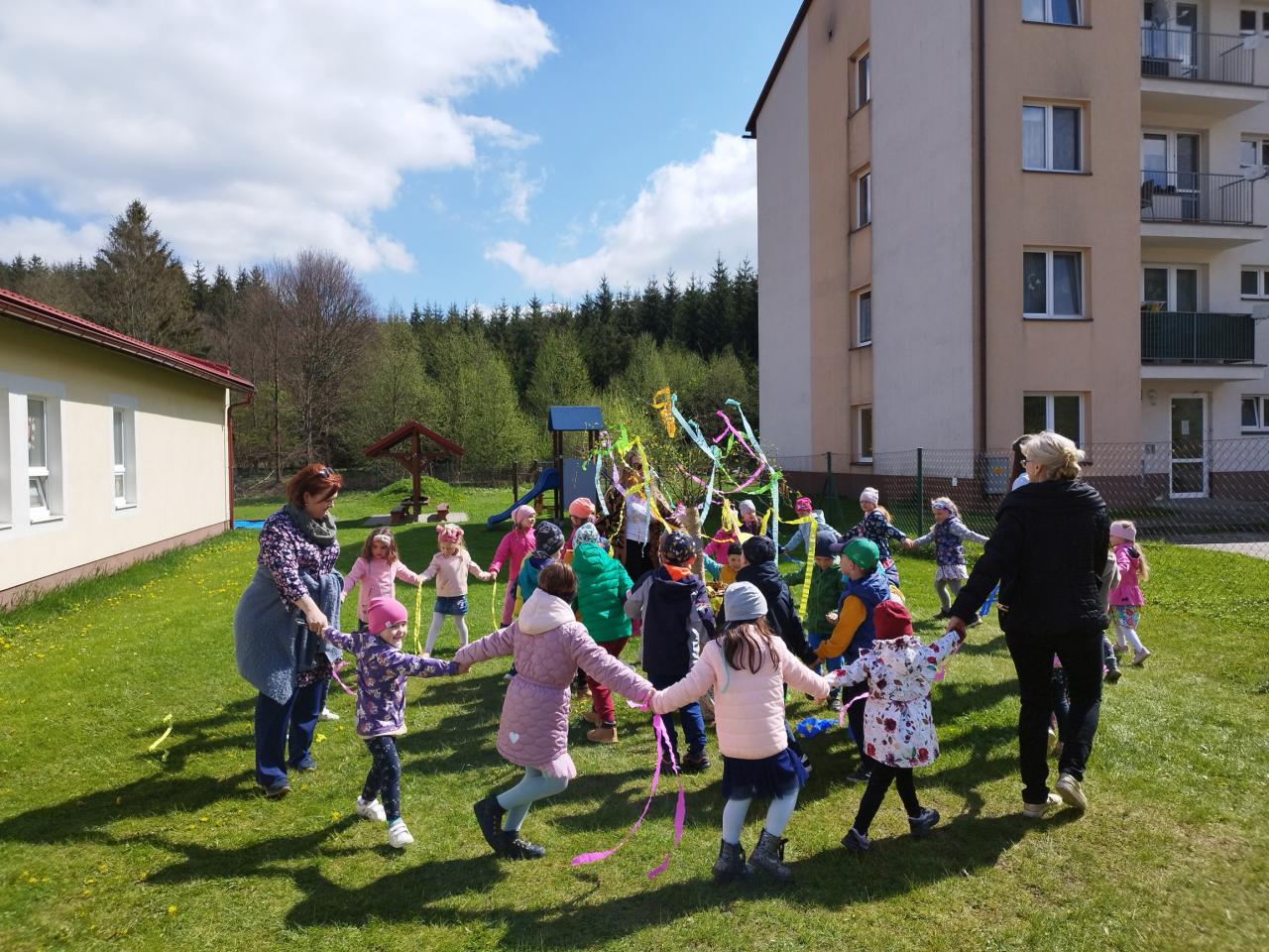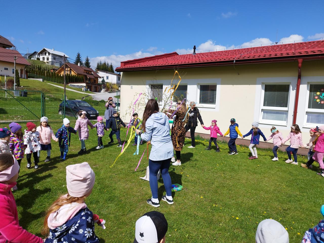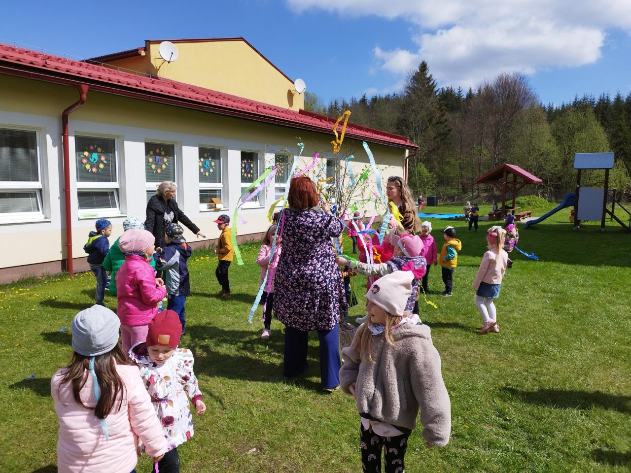 Za zvuku známych ľudových piesní i spevu piesne „Máj, máj, máj“ zdobili naše mladé pani učiteľky pripravený máj farebnými stuhami z krepového papiera. Deti im pri tom spievali a tancovali. Spoločne sme sa tešili z krásne ozdobeného Mája, ktorý bude pri vchode do MŠ krášliť okolie celý mesiac. Deti si aj takýmto spôsobom pripomenuli regionálne tradície.