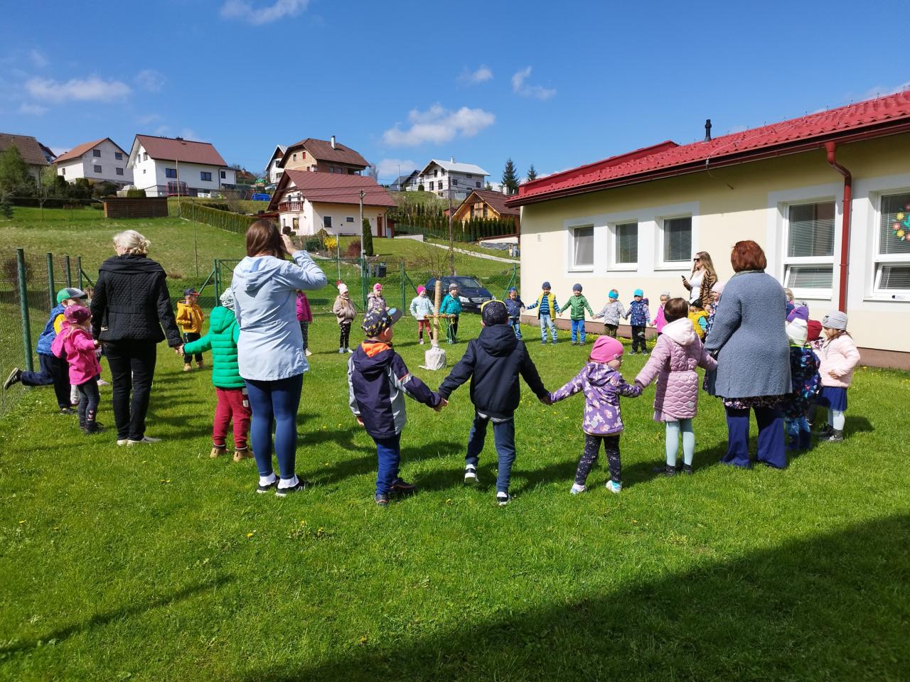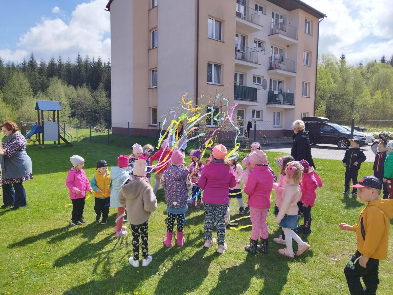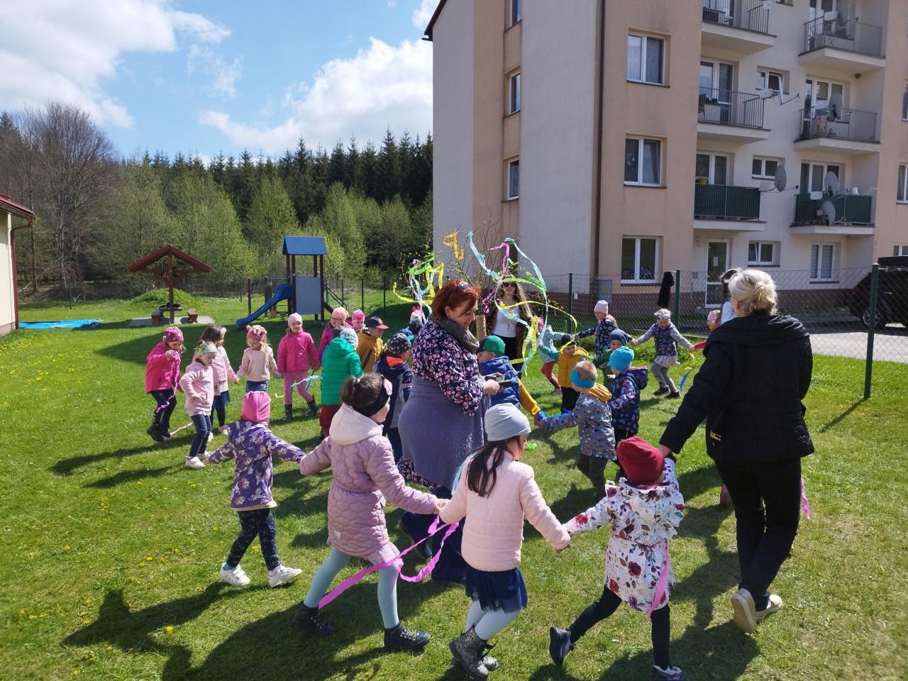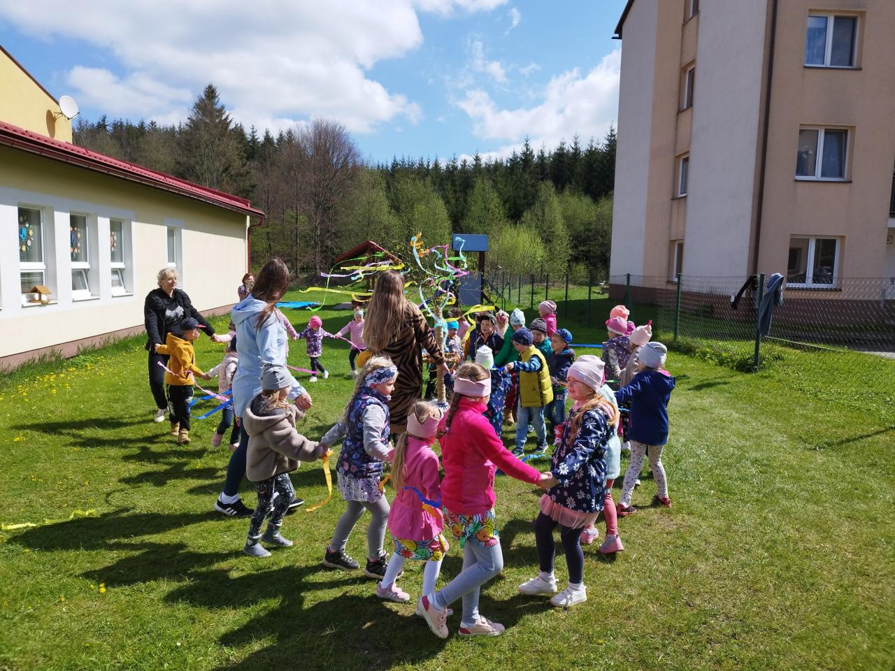 Za zvuku známych ľudových piesní i spevu piesne „Máj, máj, máj“ zdobili naše mladé pani učiteľky pripravený máj farebnými stuhami z krepového papiera. Deti im pri tom spievali a tancovali. Spoločne sme sa tešili z krásne ozdobeného Mája, ktorý bude pri vchode do MŠ krášliť okolie celý mesiac. Deti si aj takýmto spôsobom pripomenuli regionálne tradície.