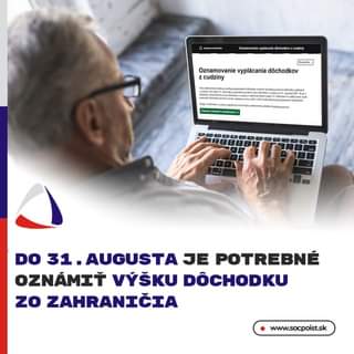Ak poberáte dôchodok z cudziny, zo zákona máte povinnosť oznámiť jeho sumu Sociálnej poisťovni do 31. augusta 2023. Postup na oznámenie je rovnaký ako minulý rok. Je potrebné použiť e-formulár dostupný na webovom sídle Sociálnej poisťovne. Použitie uvedeného elektronického formulára je jednoduché. Po zapísaní základných identifikačných údajov dôchodcu do príslušných častí e-formulára treba uviesť údaje o dôchodku z cudziny a elektronický formulár odoslať Sociálnej poisťovni.