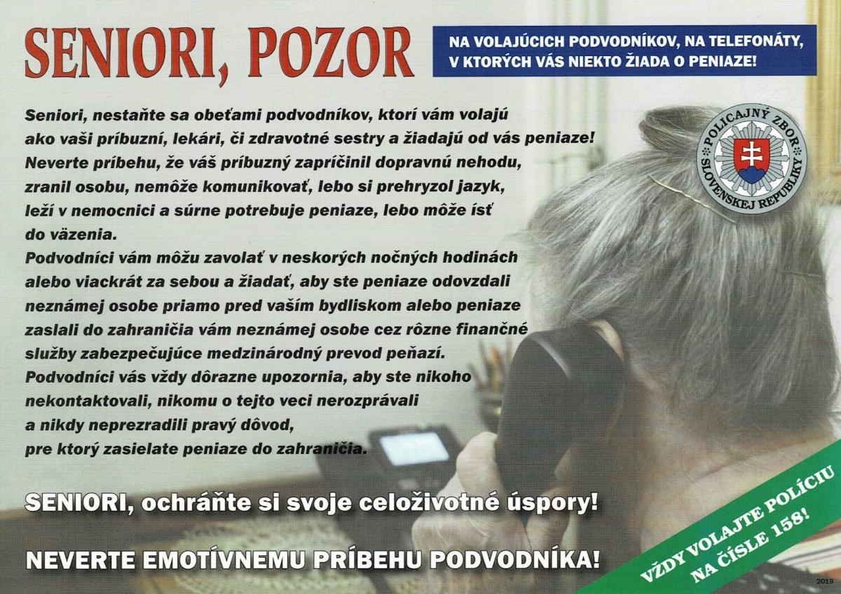 Nakoľko v poslednom období v okrese Čadca dochádza zo strany doposiaľ neznámeho páchateľa alebo páchateľov k podvodným telefonátom zameraných prevažne na seniorov za účelom vylákania finančnej hotovosti resp. iných cennosti ako zlato a podobne, žiada Okresné riaditeľstvo Policajného zboru v Čadci občanov o maximálnu opatrnosť pri komunikácií s neznámymi osobami a ich spoluprácu z cieľom predídenia prípadných ďalších škôd na majetku predovšetkým seniorov.