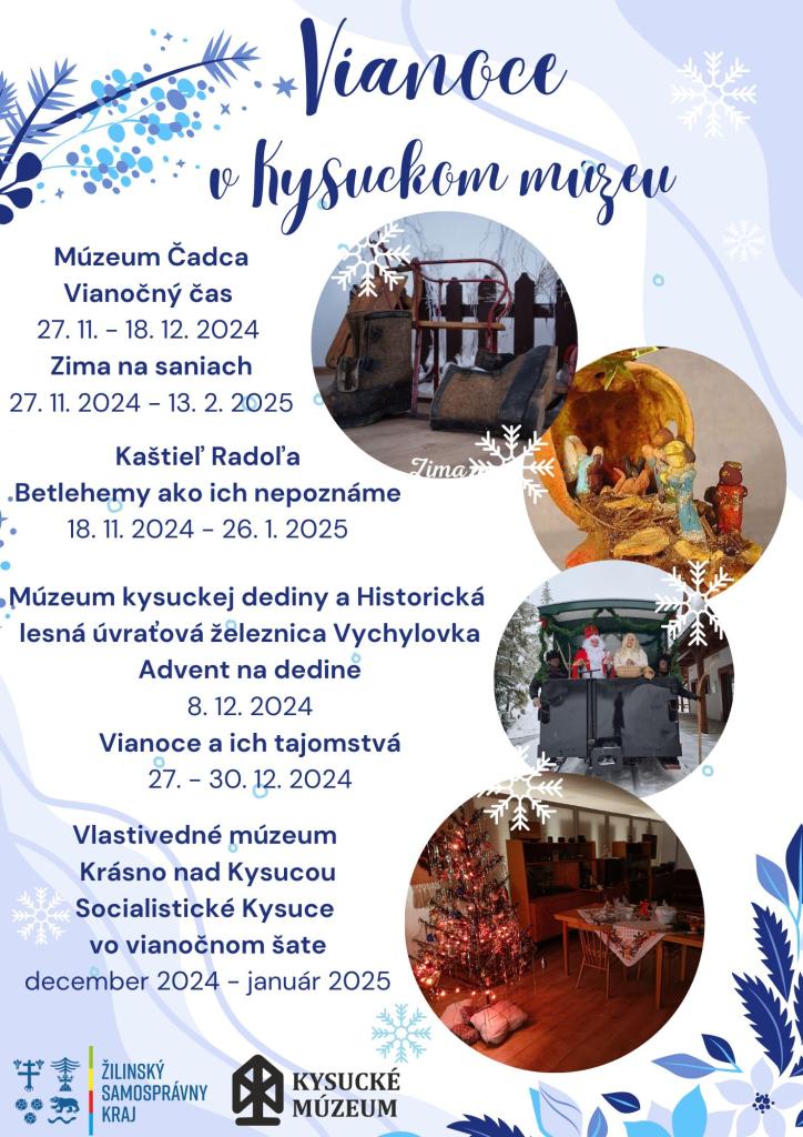 V Múzeu Čadca sme pripravili dve výstavy s vianočnou a zimnou tematikou. Vianočný čas je názov každoročnej predajnej výstavy, na ktorej sa prezentujú ľudoví remeselníci a kreatívni tvorcovia z nášho regiónu. Výstava potrvá od 27. novembra do 18. decembra 2024. Už tradične nebude chýbať ani kreatívny program pre organizované skupiny - maľovanie sklenených vianočných ozdôb. Tvorivé dielne budú prebiehať počas pracovných dní, je potrebné sa vopred objednať.